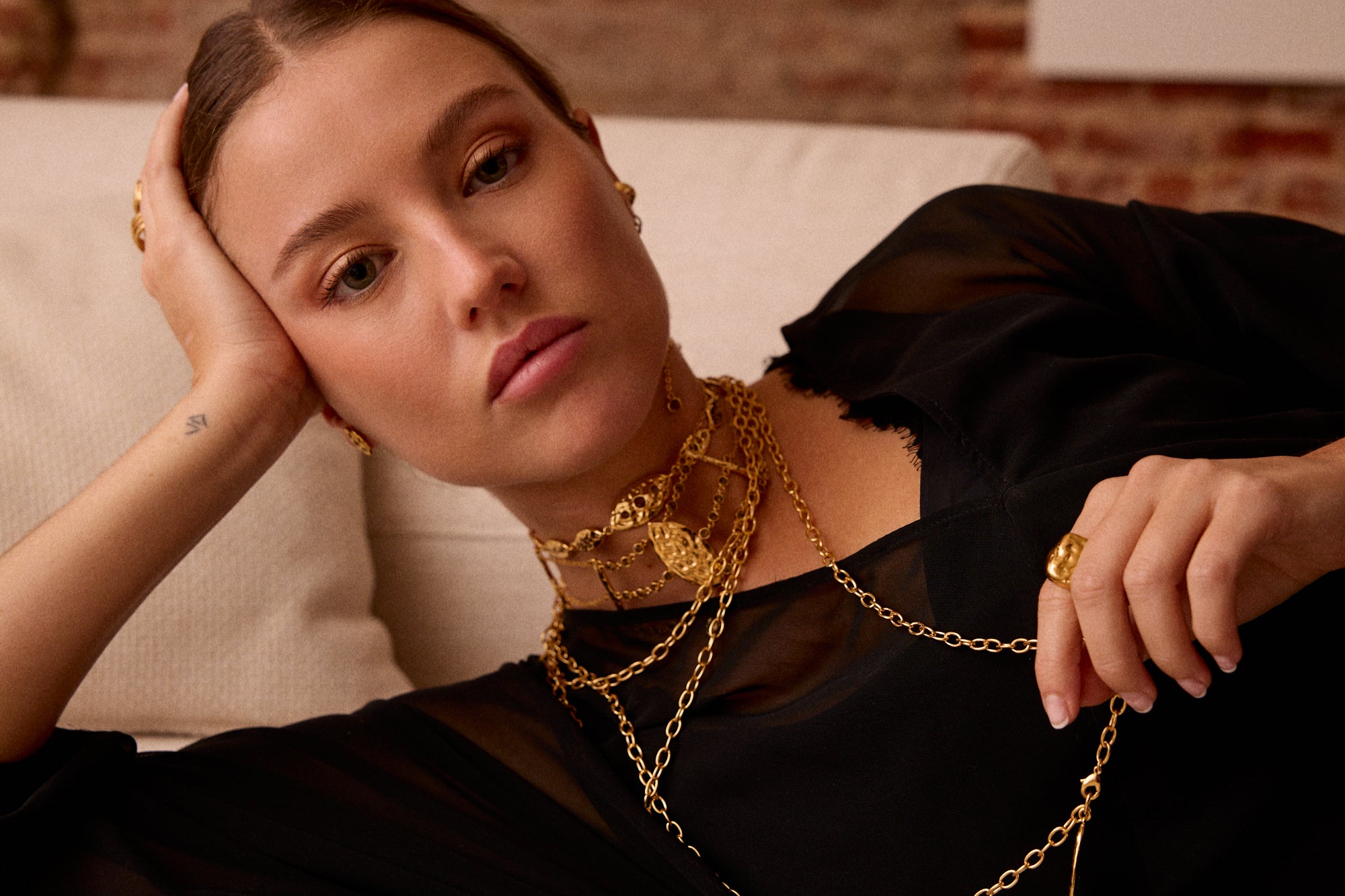 Una pieza cargada de simbolismo, luz y sensibilidad artística. Confeccionada en latón chapado en oro de 18 kt, cuenta con un acabado final de 24 quilates que le aporta un brillo cálido y sofisticado.