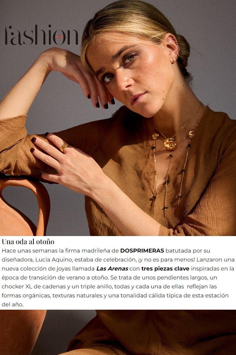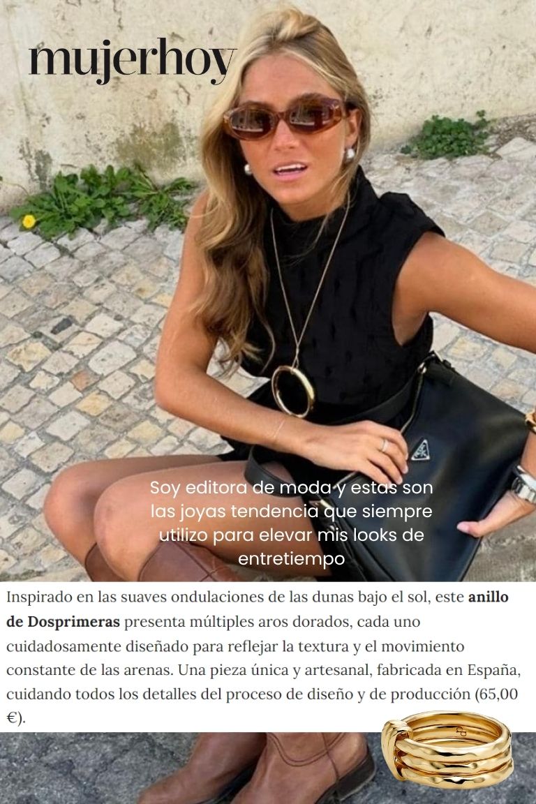 LEEREl anillo de Dosprimeras presenta múltiples aros dorados, reflejando la textura y el movimiento constante de las arenas.