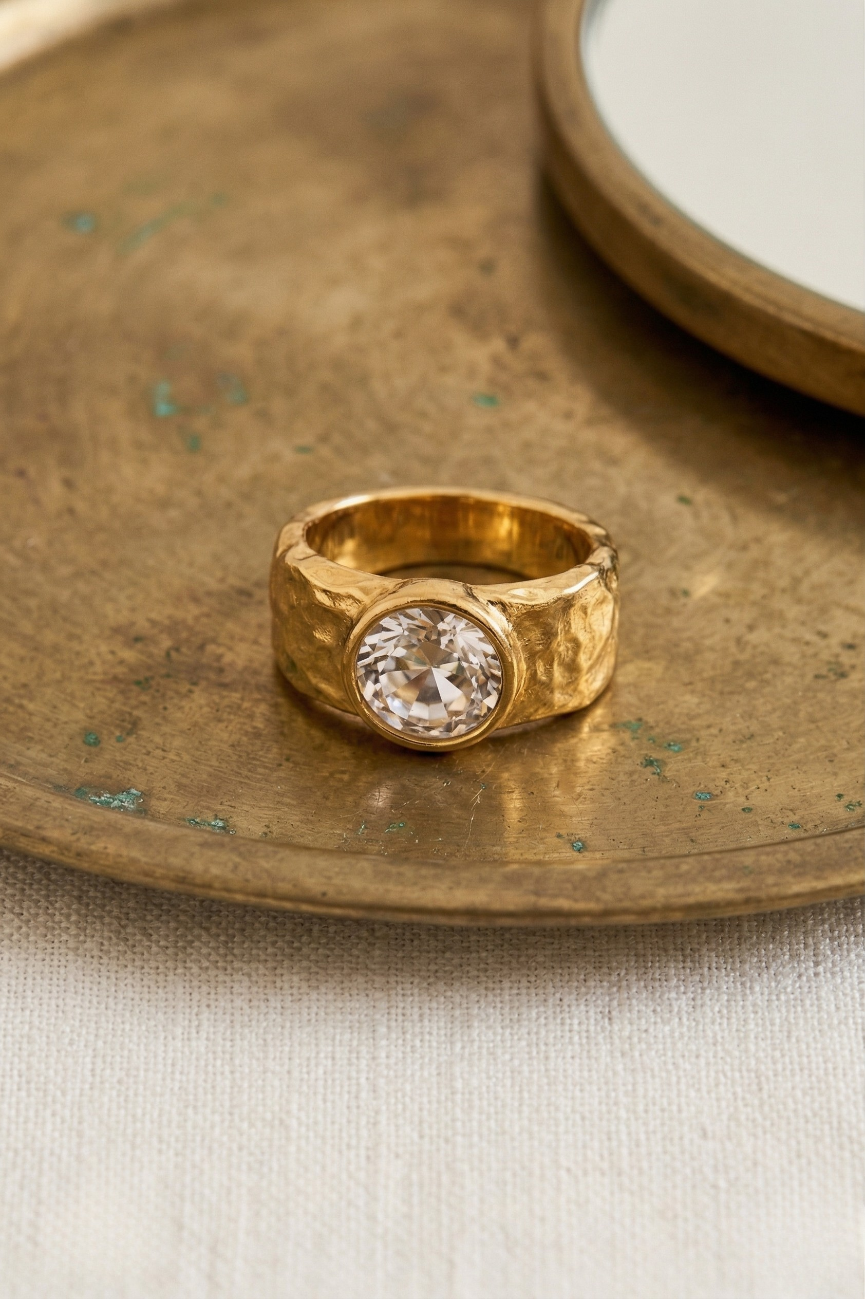 As its name describes, this very special ring stands out for having a central focus of light. It is a large white Czech crystal, embedded in the sphere with hammered technique, one of Dosprimeras' signature features.