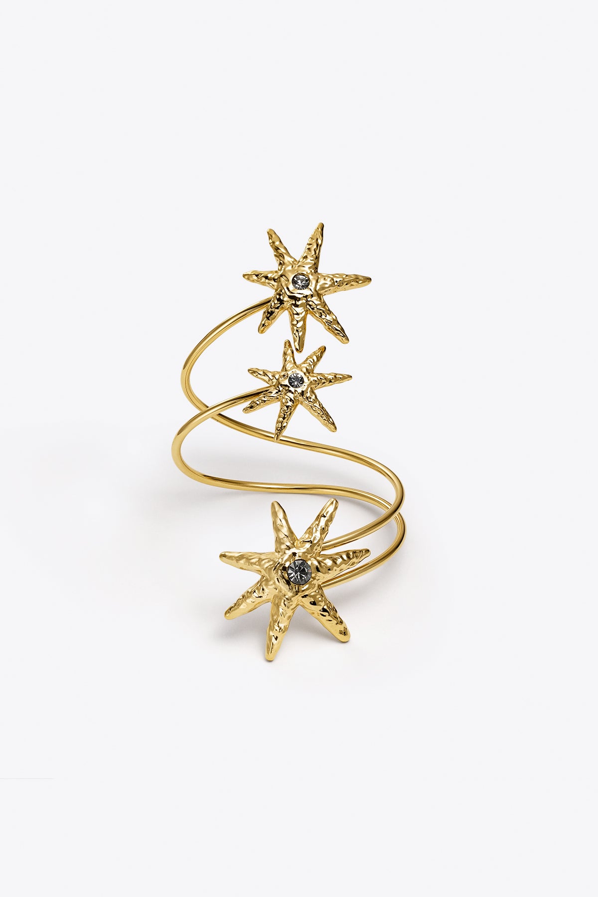 Esta elegante pulsera envolvente está bañada en oro de 24 kt y cuenta con tres estrellas de diferentes tamaños con cristales Black Diamond en color gris, los cuales reflejan la luz de forma sutil, al igual que los diamantes.
