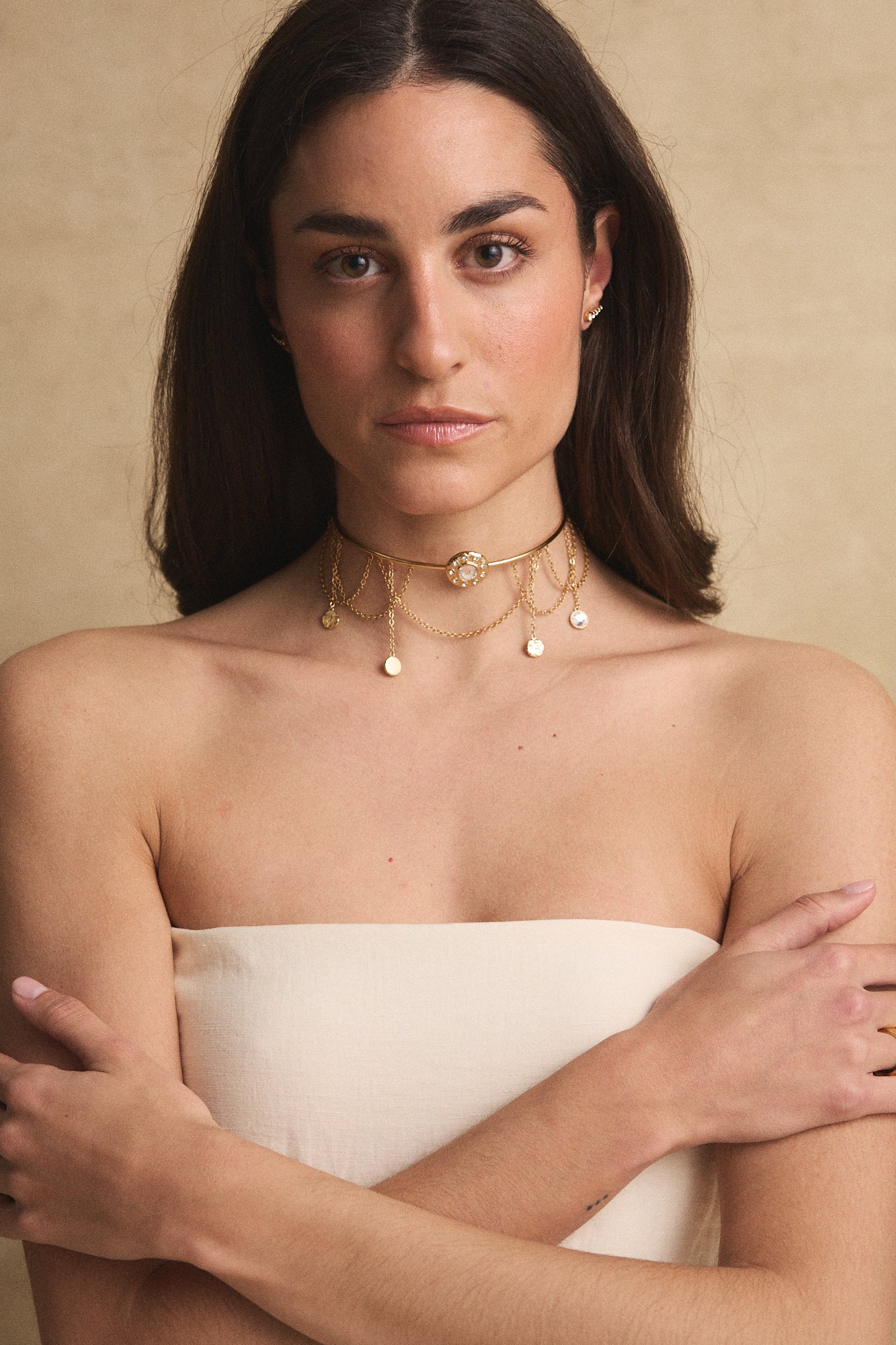 Su diseño combina una delicada estructura dorada, moldeable para adaptarse a diversas alturas en el cuello, con finas cadenas que caen con elegancia y un resplandeciente centro adornado con piedras brillantes.