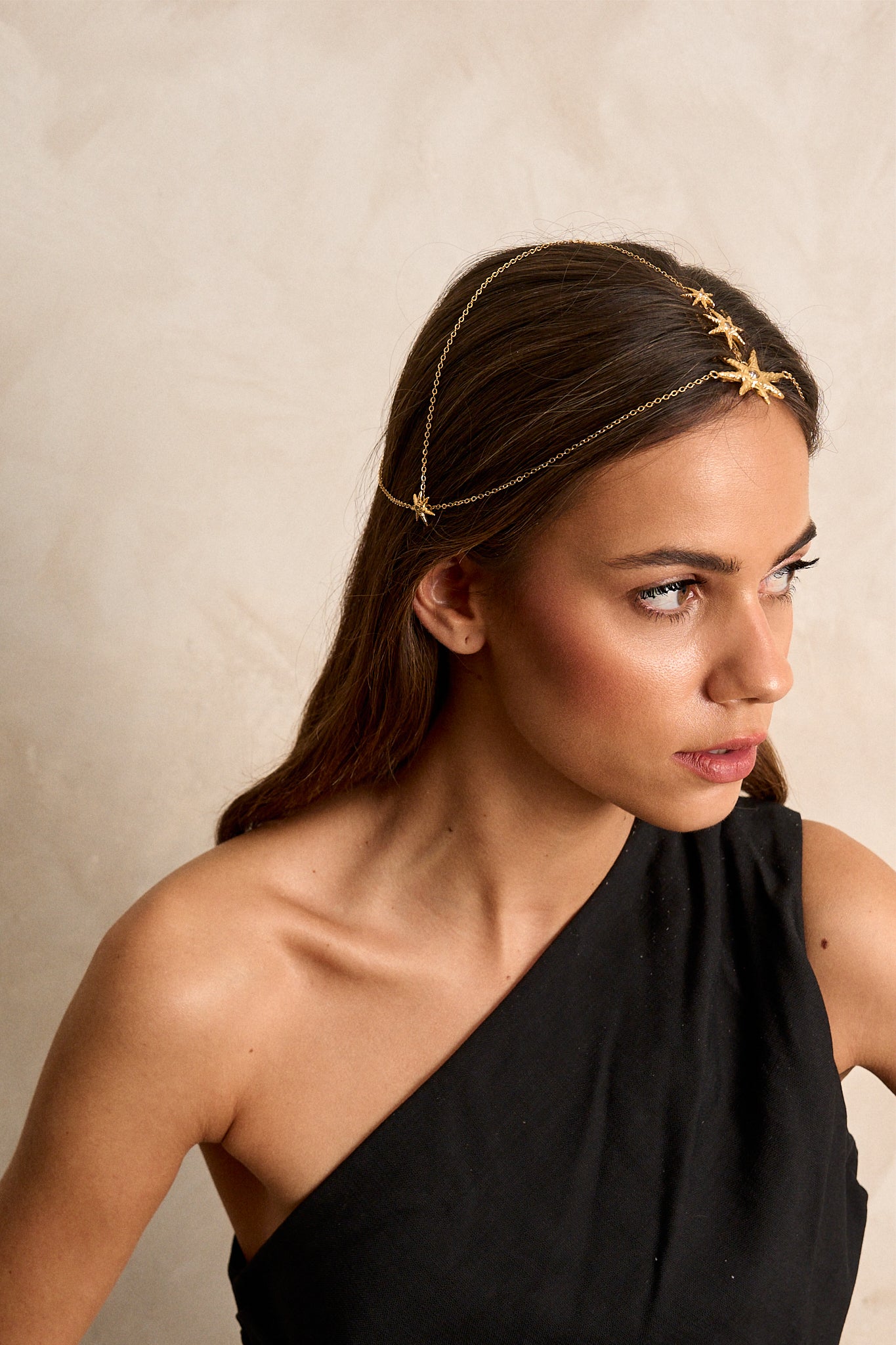 El tocado de cadenas estelar para mujer es un elegante diseño para adornar tu cabello en ocasiones especiales.