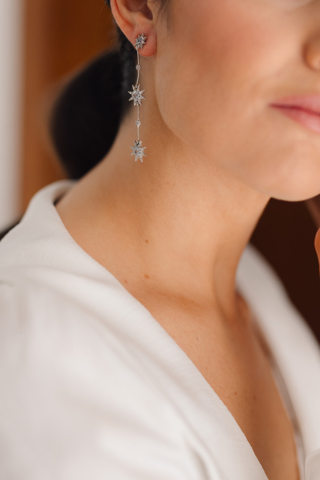 Descubre la elegancia de nuestros pendientes de novia de tres estrellas. Adornados con circonitas azules y blancas, estos pendientes son el complemento perfecto para tu look de novia.