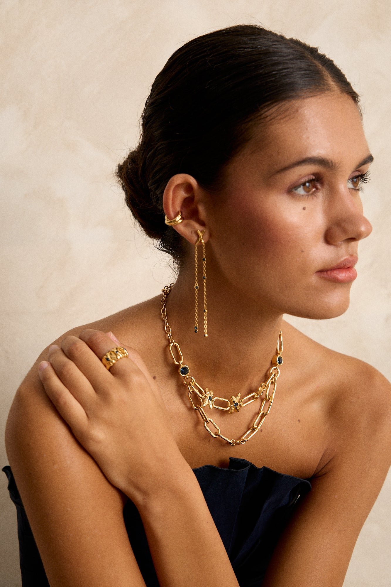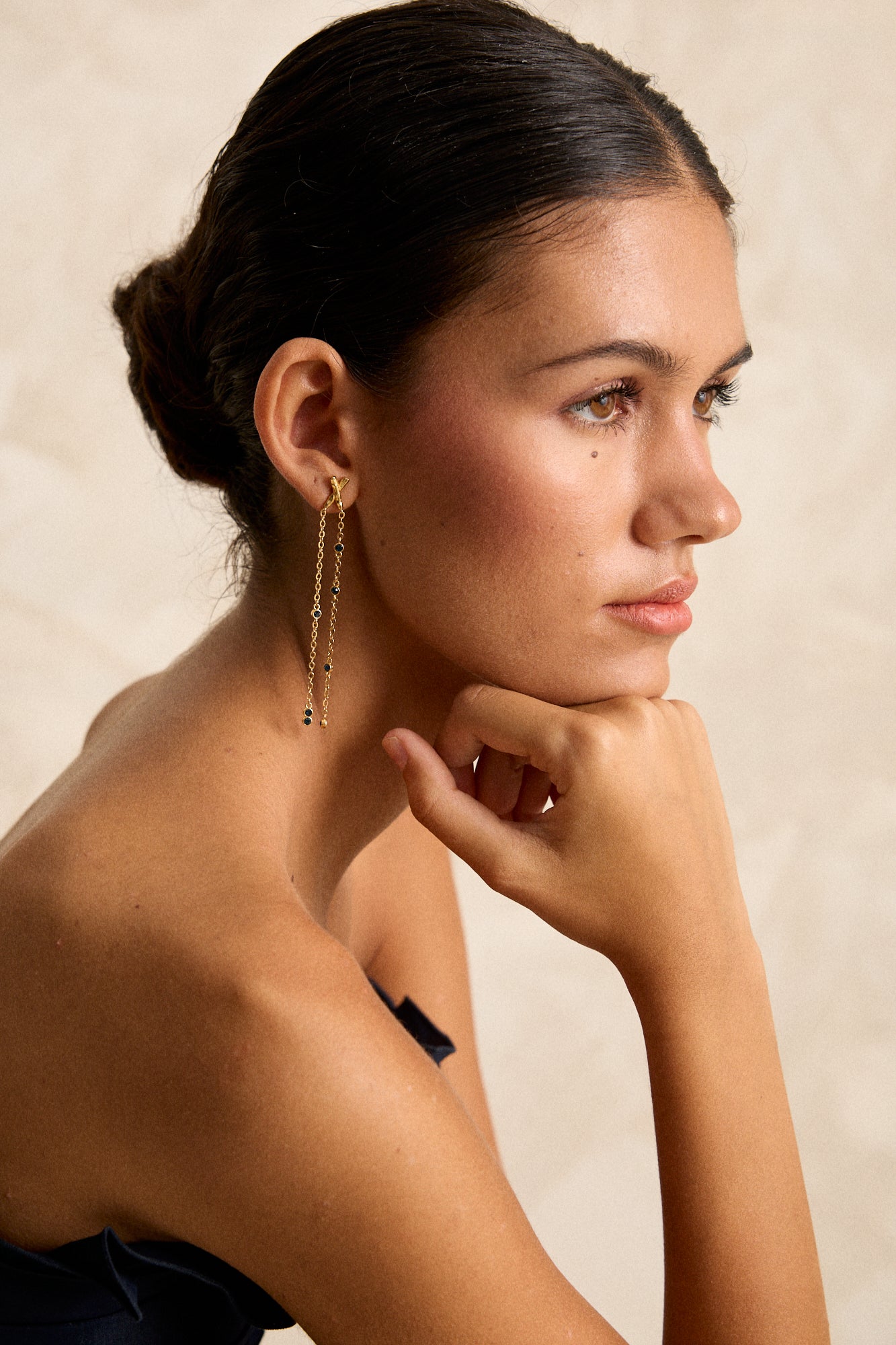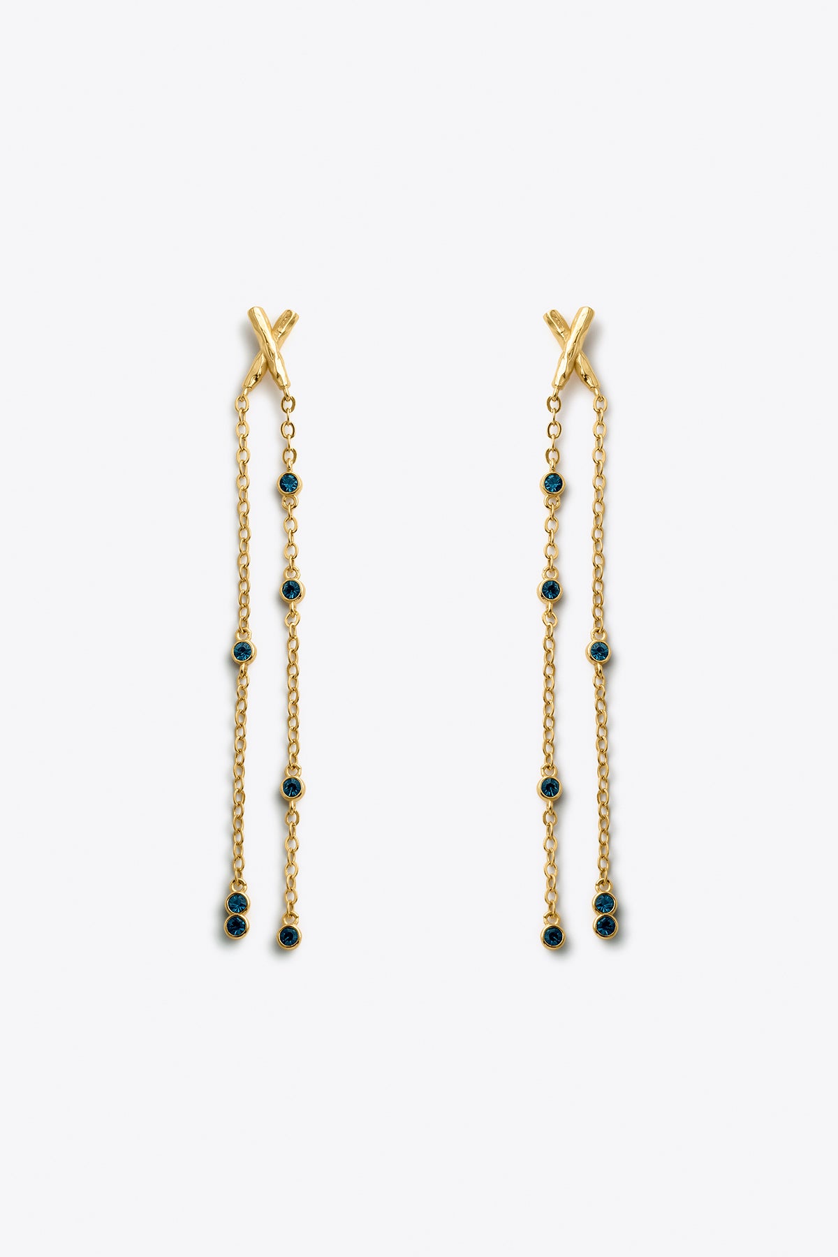 Desde cada cruz caen dos finas cadenas de oro, ligeras y elegantes, salpicadas de cristales checos en tono azul zafiro.