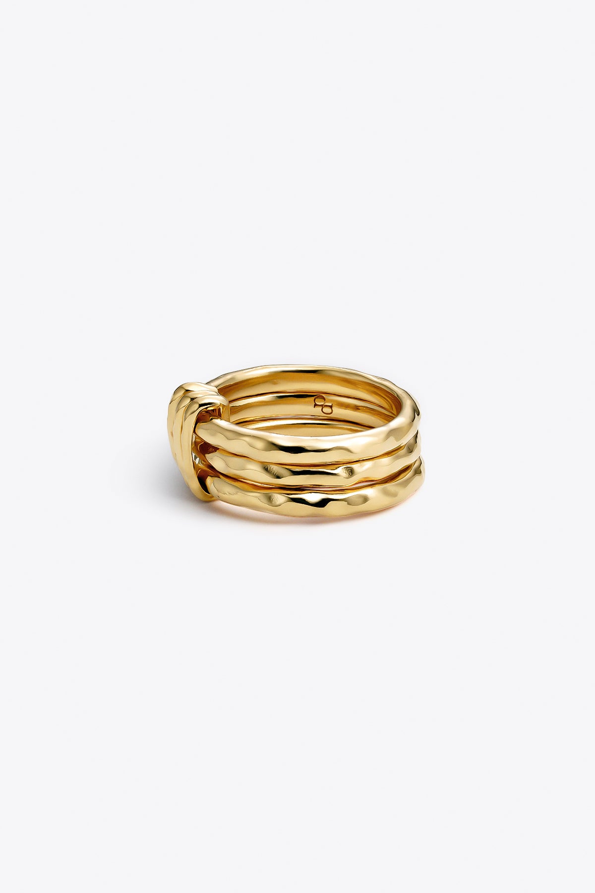 Inspirado en las suaves ondulaciones de las dunas bajo el sol, este anillo presenta múltiples aros dorados, cada uno cuidadosamente diseñado para reflejar la textura y el movimiento constante de las arenas.