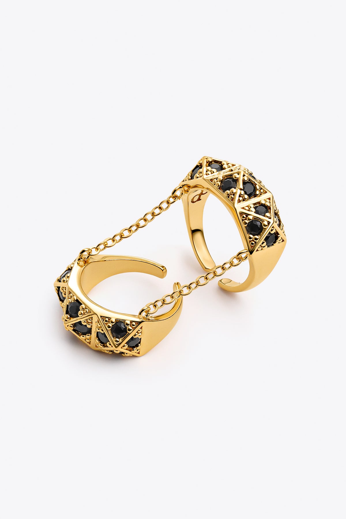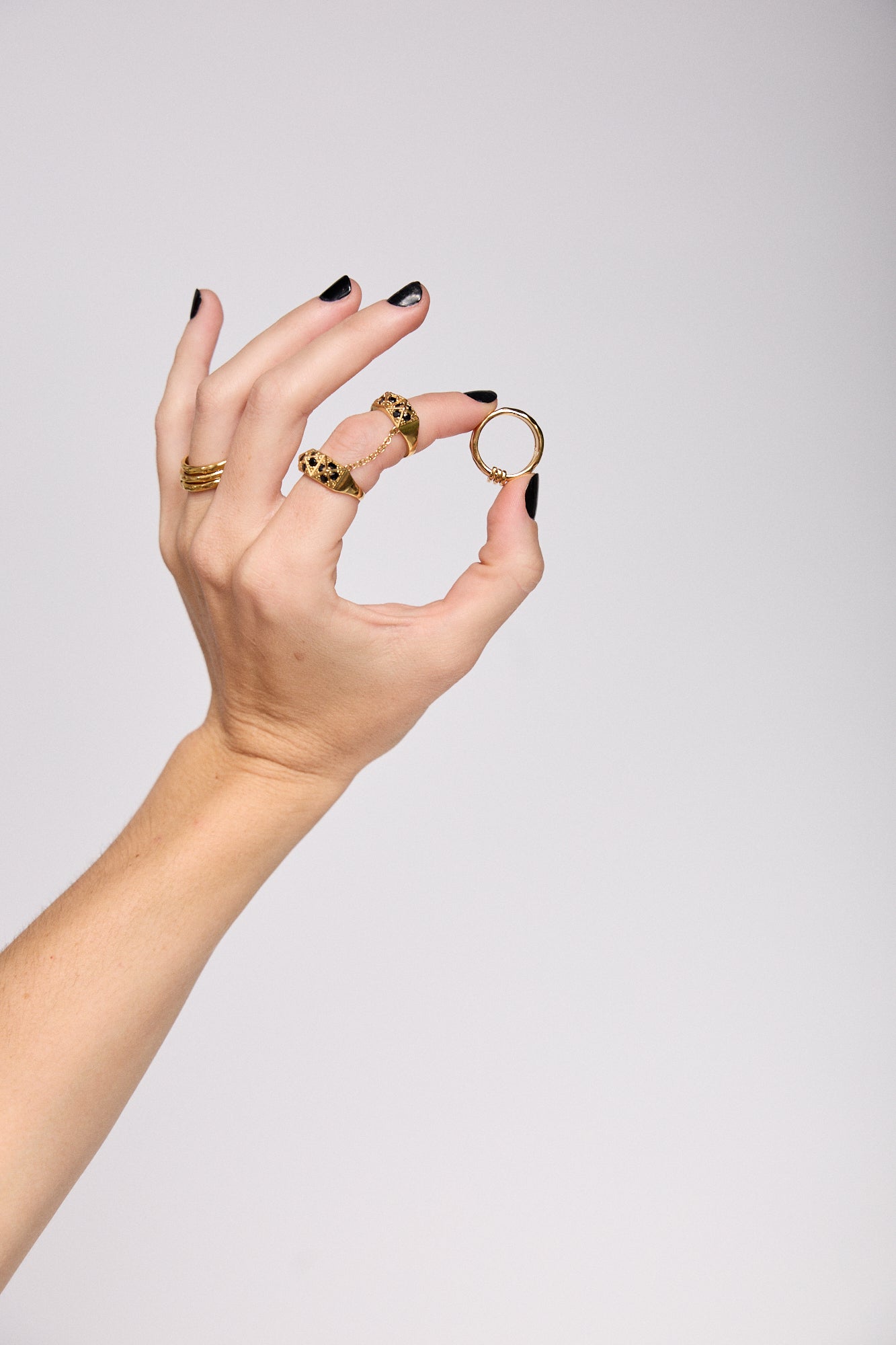 Hasta ahora, el anillo más sofisticado e innovador que hemos diseñado hasta la fecha. Dos anillos unidos entre sí por dos cadenas, de latón bañado en oro de 24 kt.