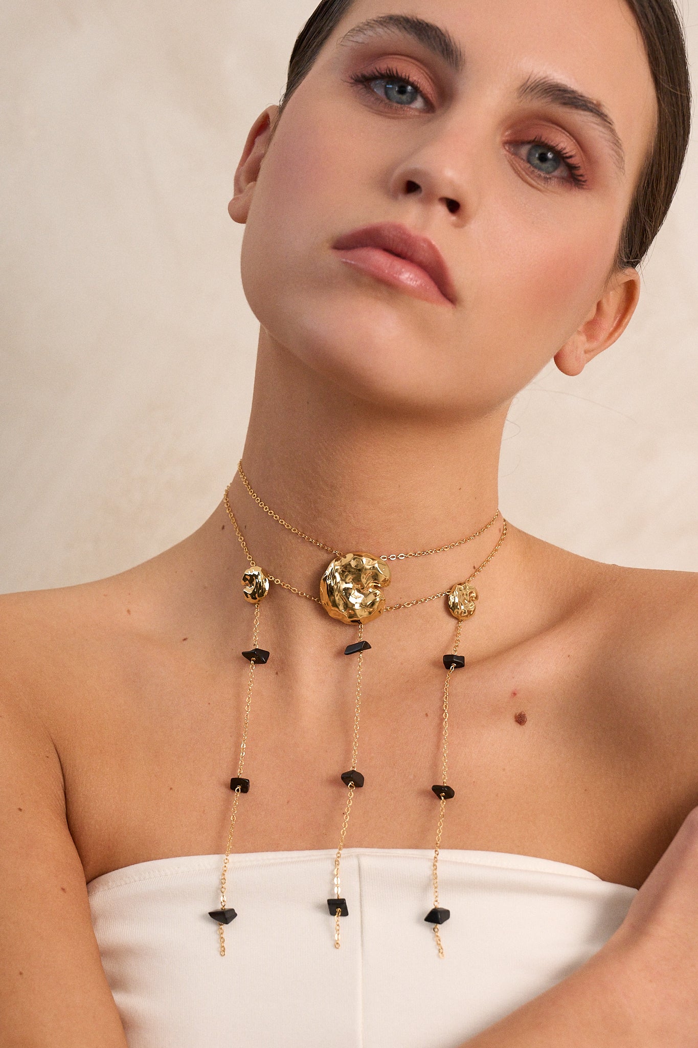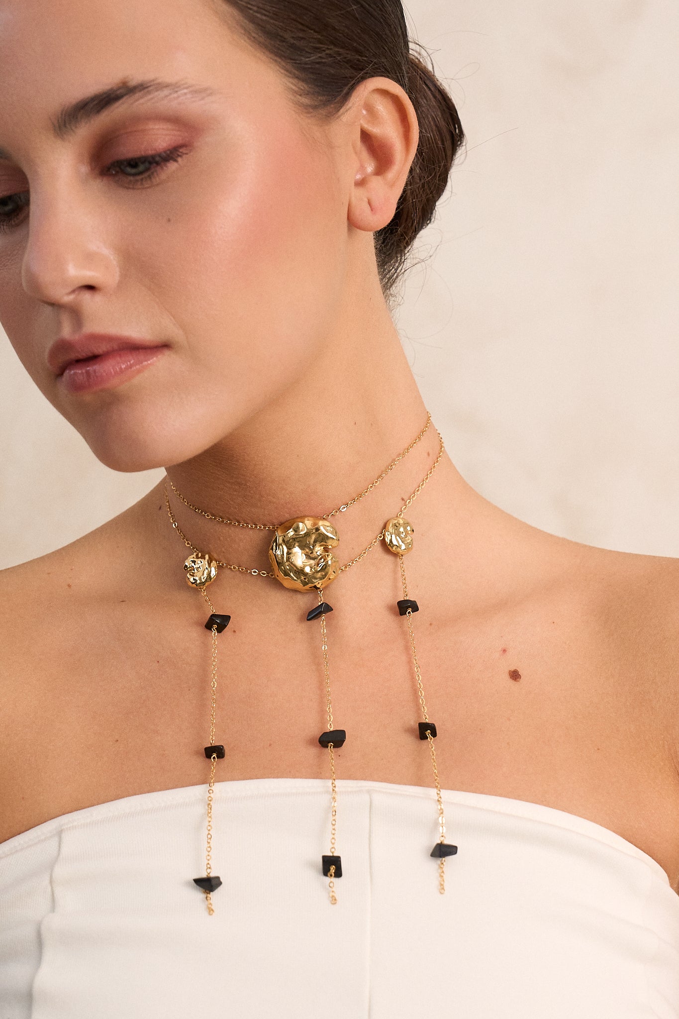 Pieza de latón bañada en oro de 24 kt, cuenta con piedras negras asimétricas.