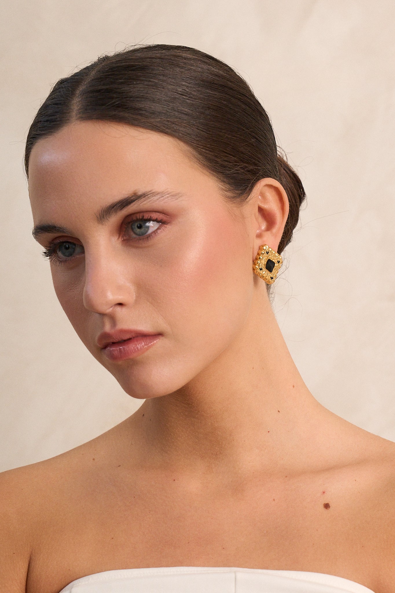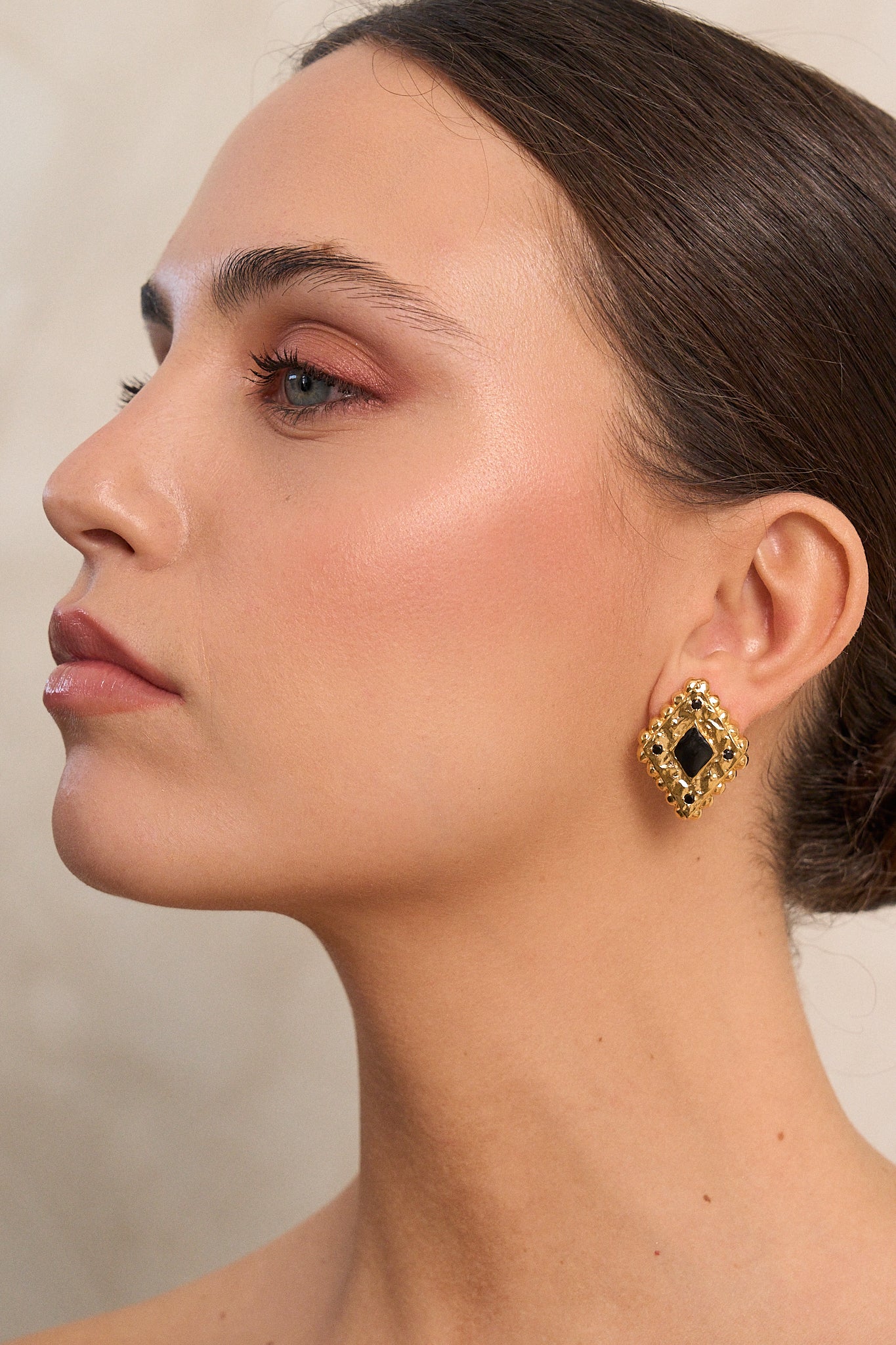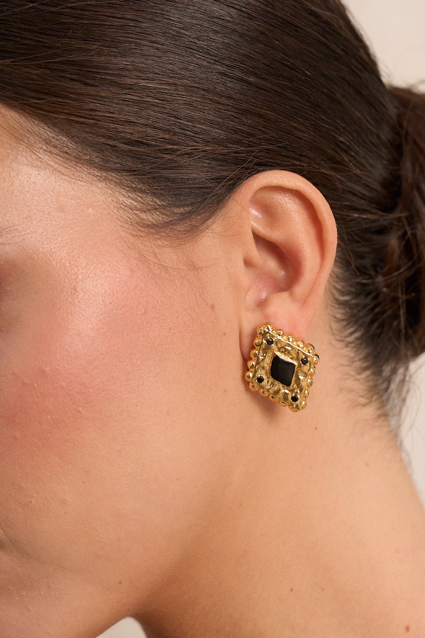 Pieza de latón bañada en oro de 24 kt, cuenta con cuatro circonitas negras en los bordes y un rombo esmaltado a mano. El efecto de la pieza central es martelé.