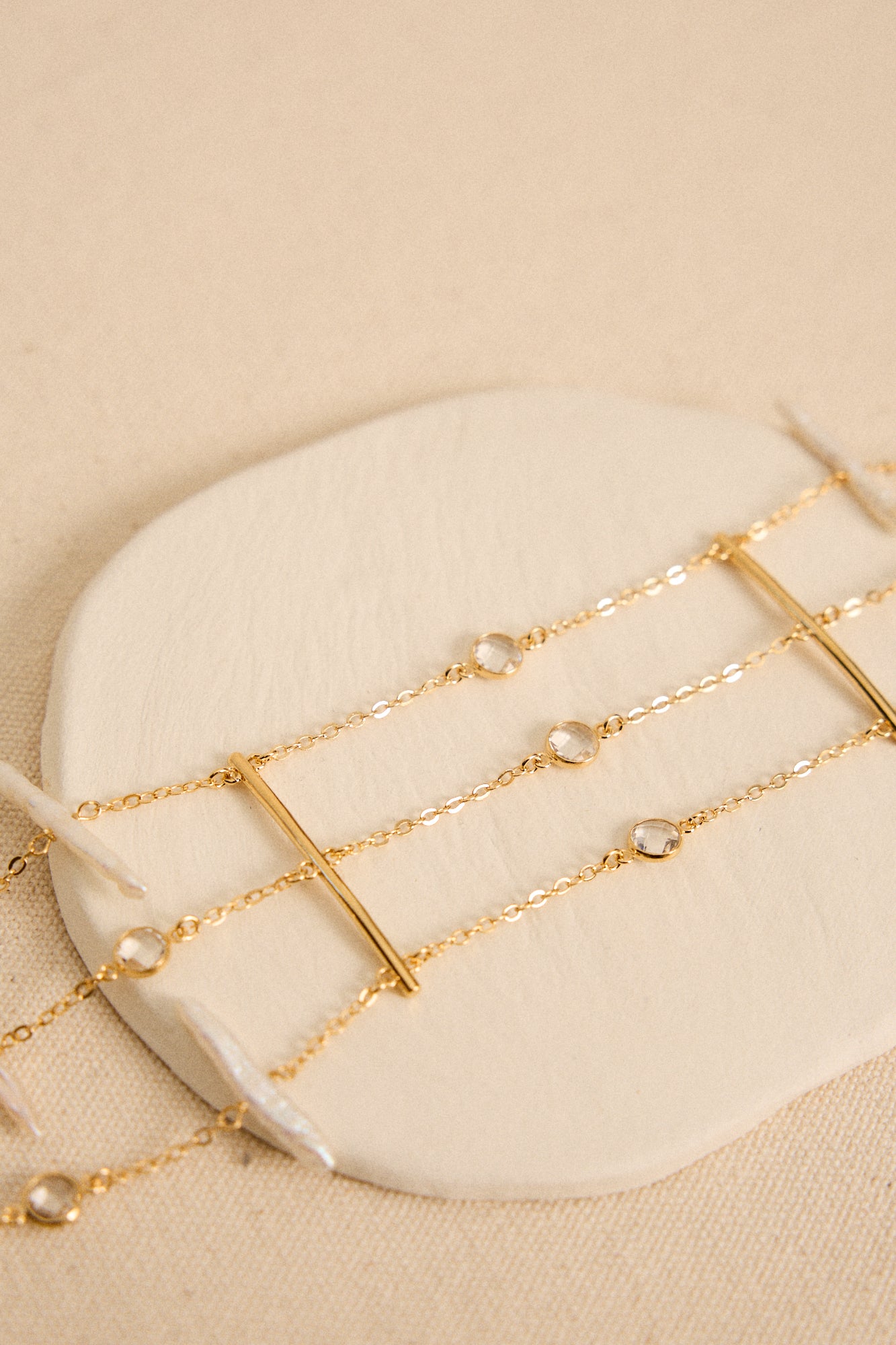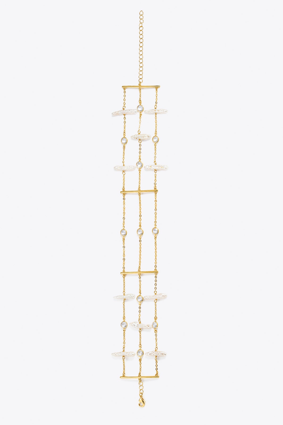 Está compuesto por perlas barrocas, dispuestas de manera alterna y cristales transparentes en engaste biselado que añaden un brillo sutil y elegante.
