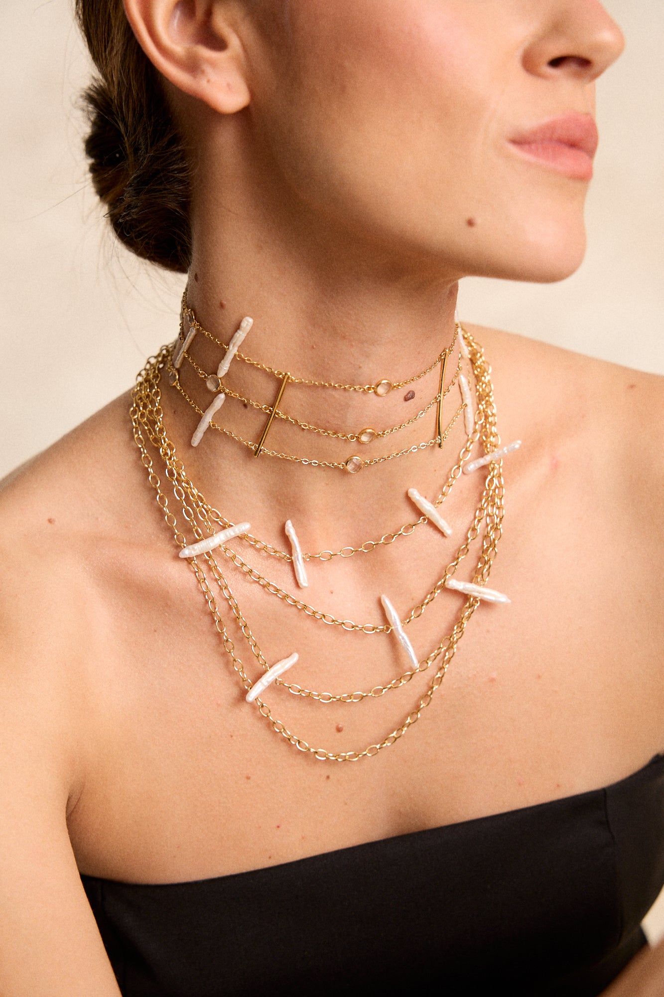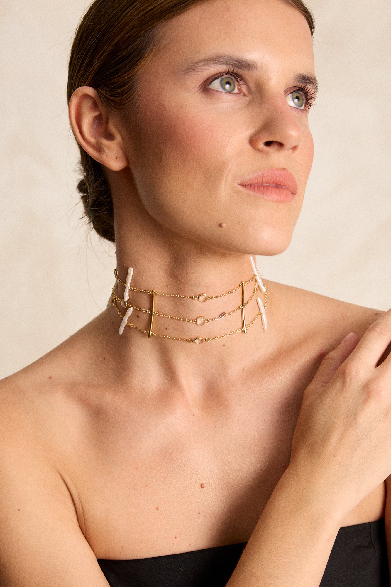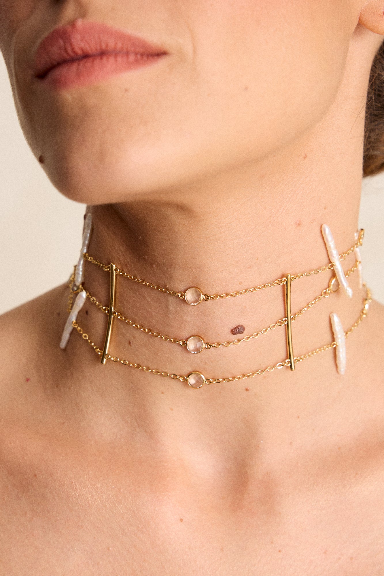 El choker está compuesto por perlas irregulares y cristales transparentes repartidos a lo largo de una cadena. Están fabricados en latón bañado en oro de 18 y 24 kt.