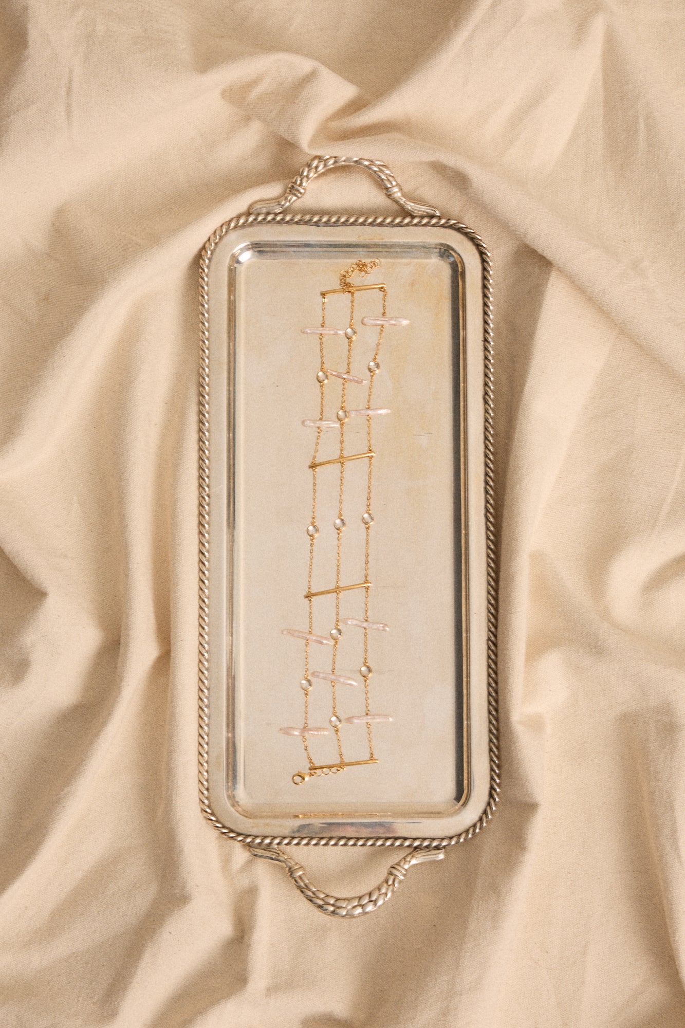 Está compuesto por perlas barrocas, dispuestas de manera alterna y cristales transparentes en engaste biselado que añaden un brillo sutil y elegante.
