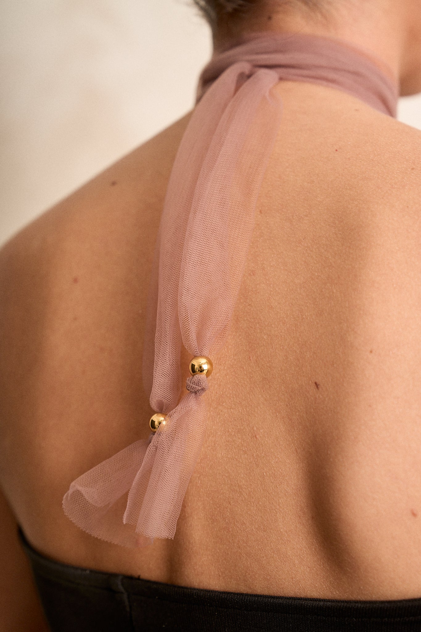 Esta elegante y original pieza está confeccionada con un suave tul en un delicado rosa empolvado.