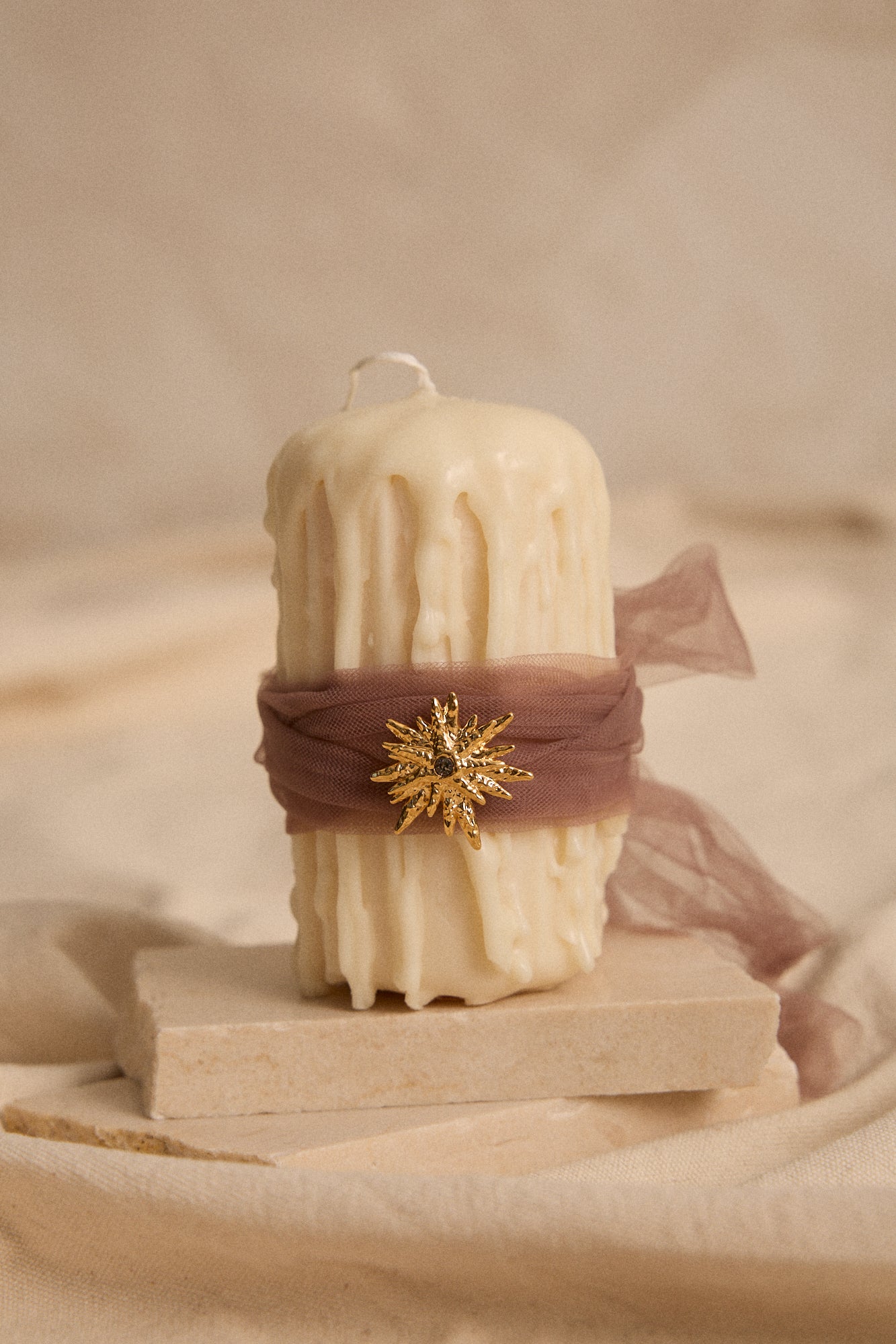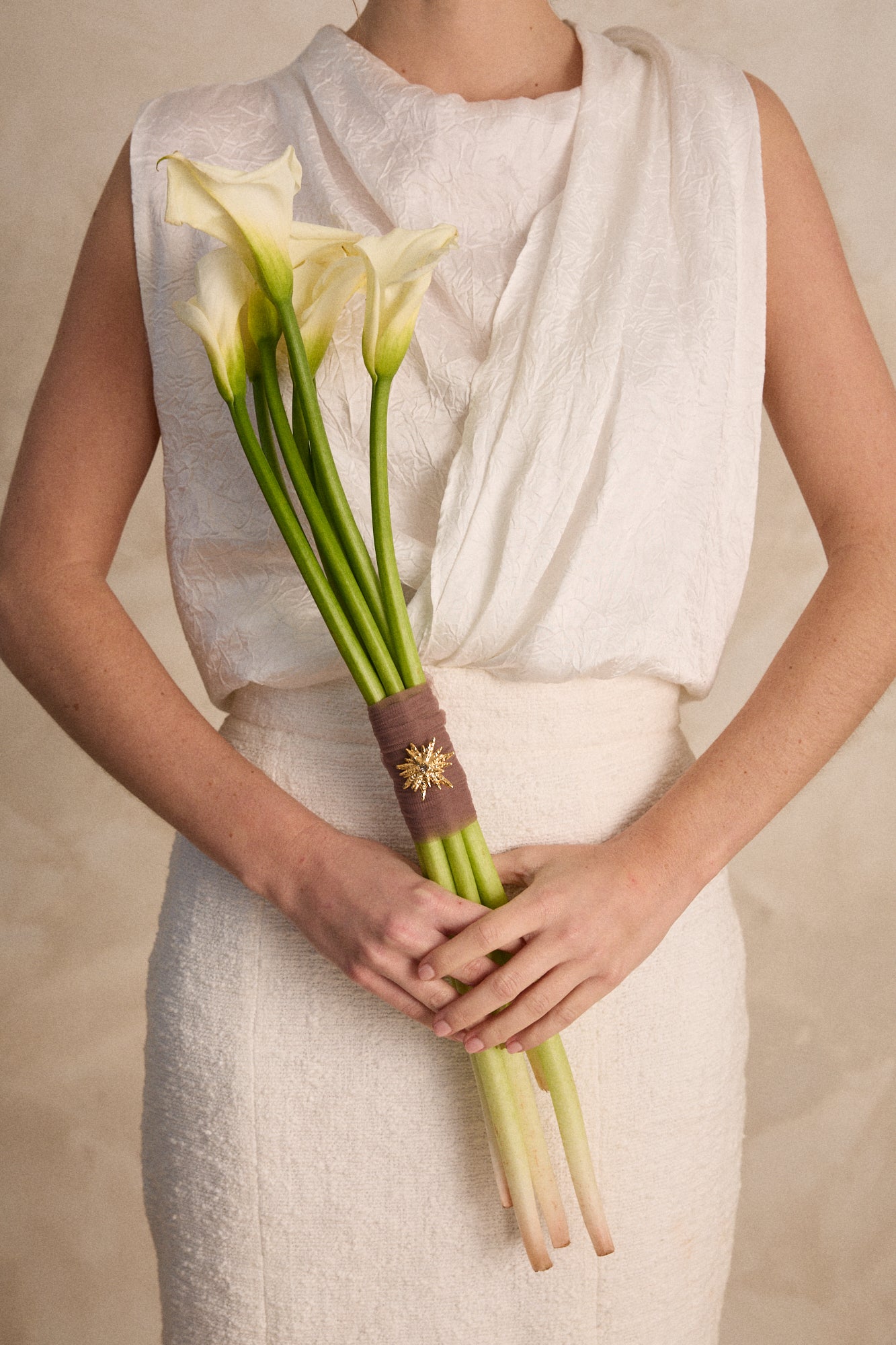 El broche dorado con forma de estrella que lo adorna está bañado en oro de 24 kt y cuenta con un cristal Black Diamond que reflejan la luz de forma sutil, al igual que los diamantes.