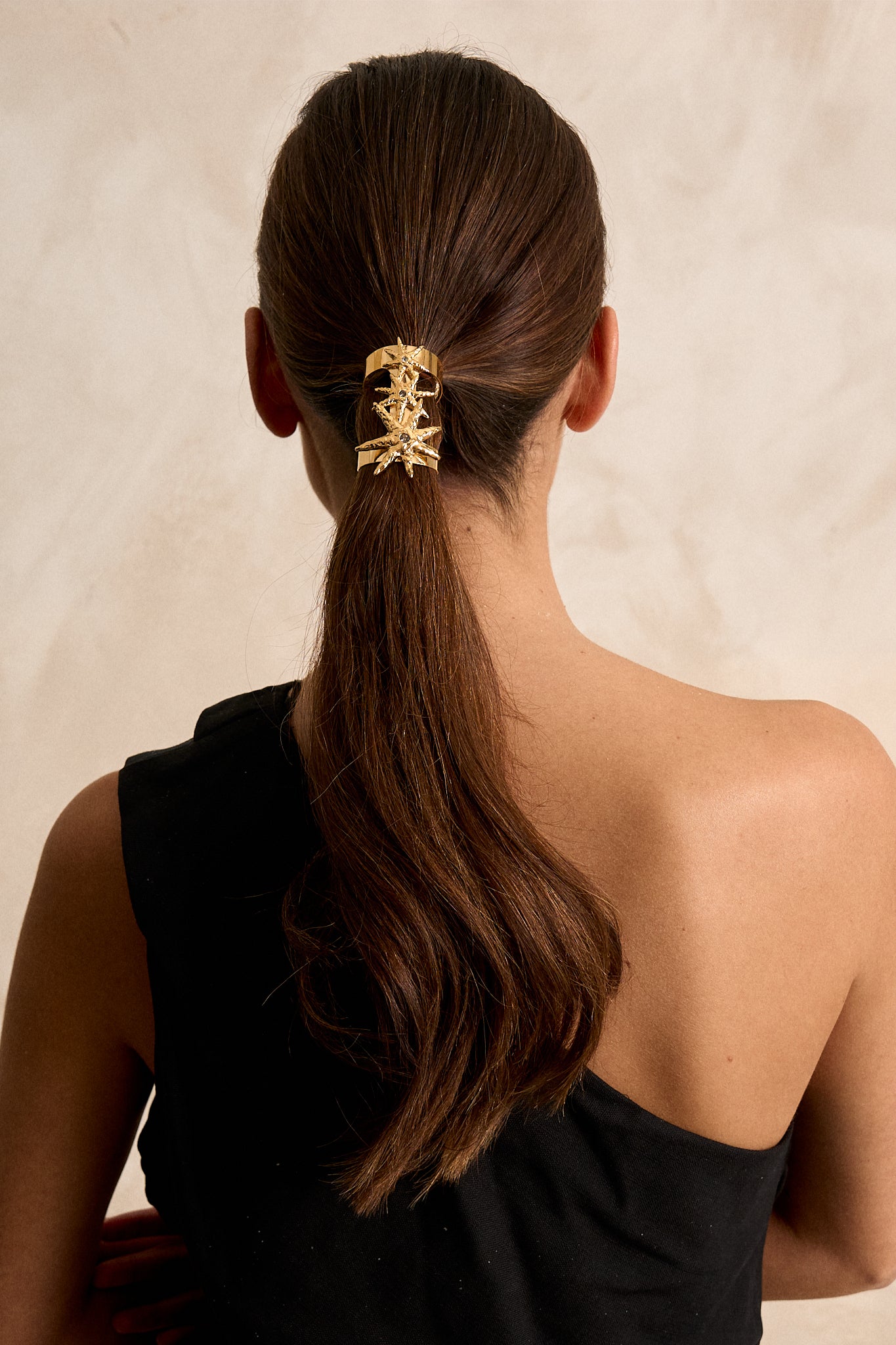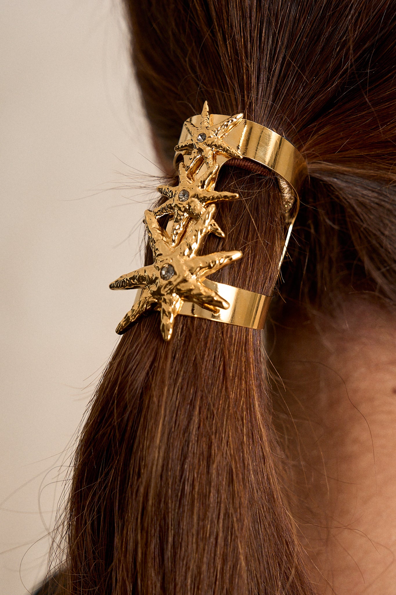 Este accesorio de pelo, estilo joya, es de latón bañado en oro de 24 kt y cuenta con tres estrellas de diferentes tamaños con cristales Black Diamond en color gris, los cuales reflejan la luz de forma sutil, al igual que los diamantes.