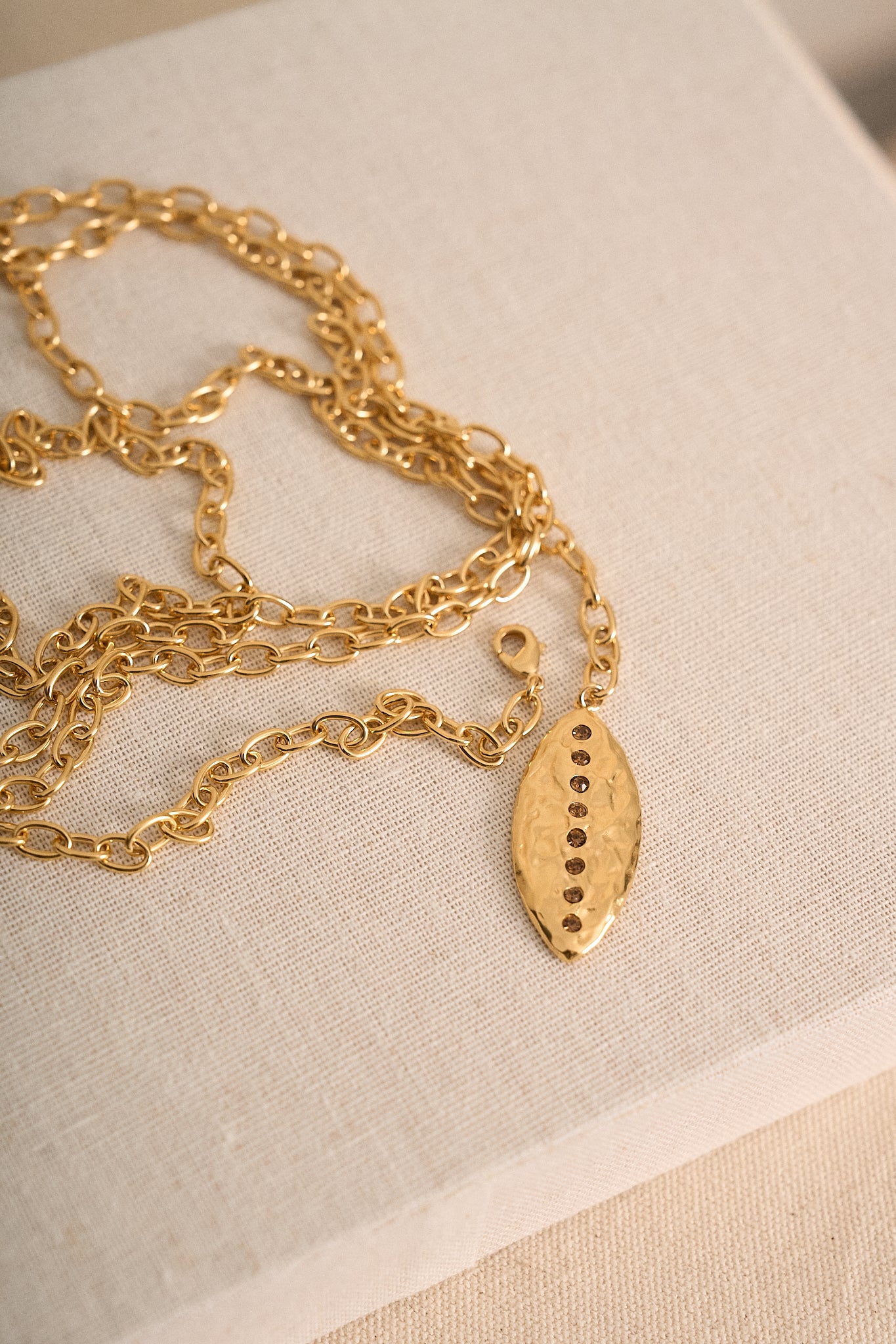 El Collar Tigris toma su nombre del legendario río que dio vida a la antigua Mesopotamia, símbolo de fluidez, abundancia y transformación. Su diseño largo y versátil evoca el curso del agua dorada que se desliza con elegancia sobre la piel.