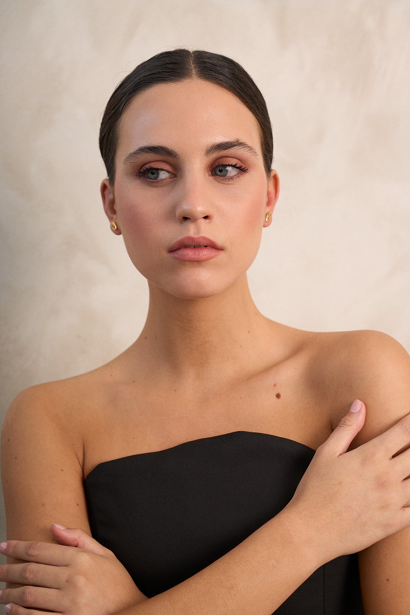 De un lado, una forma pequeña y texturada; del otro, una caída de cadenas doradas que se mueven con suavidad, capturando la luz en cada cristal, unidas a un earcuff que forma parte del mismo para conseguir esa caída.