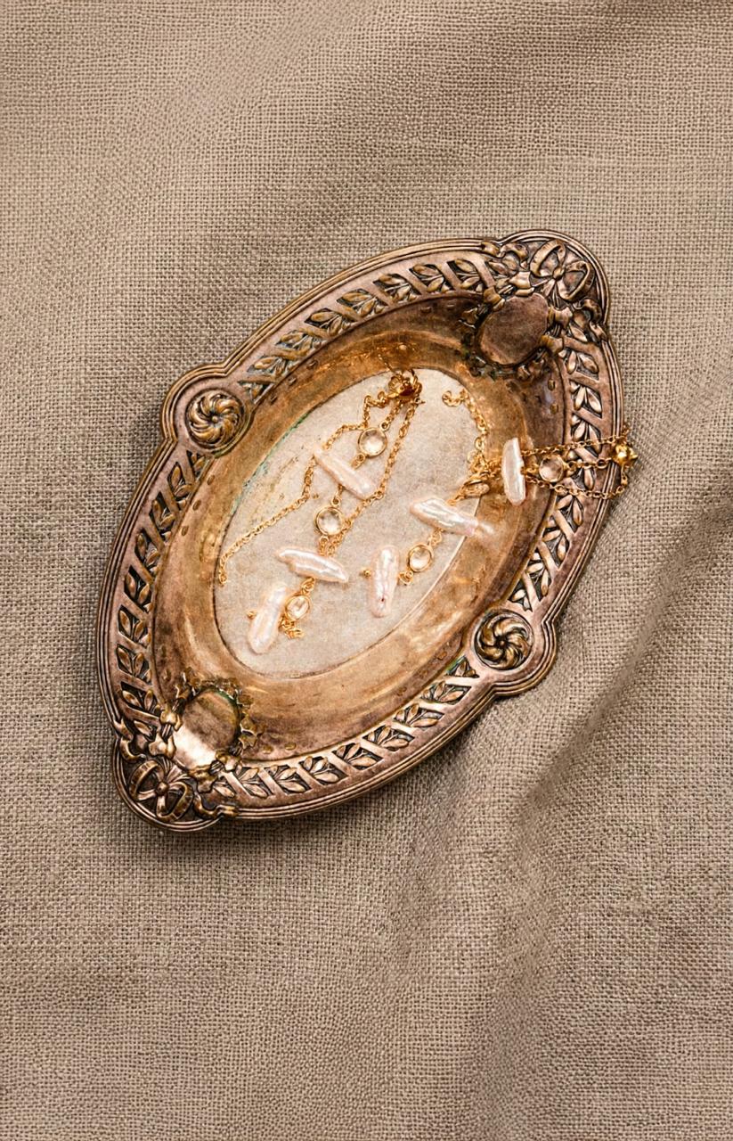 Compuestos por perlas irregulares y cristales transparentes repartidos a lo largo de una cadena. Están fabricados en latón bañado en oro de 18 y 24 kt.