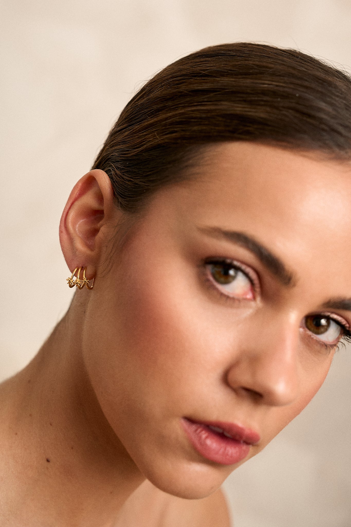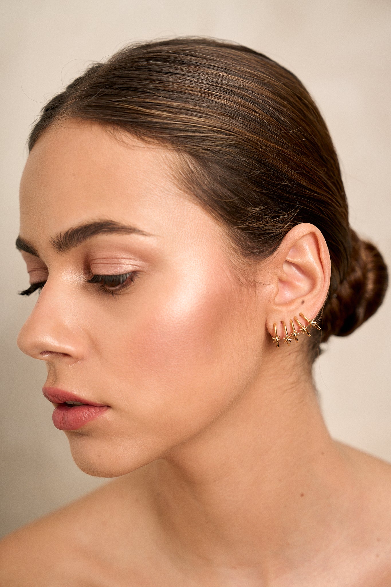 Los Pendientes Trepadores Estrella son asimétricos, formados por aros agarrados entre sí por una barra que se engancha en la oreja. Estos pendientes simulan que llevas varios agujeros en la oreja, pero realmente puedes usarlos con únicamente un agujero en ella.